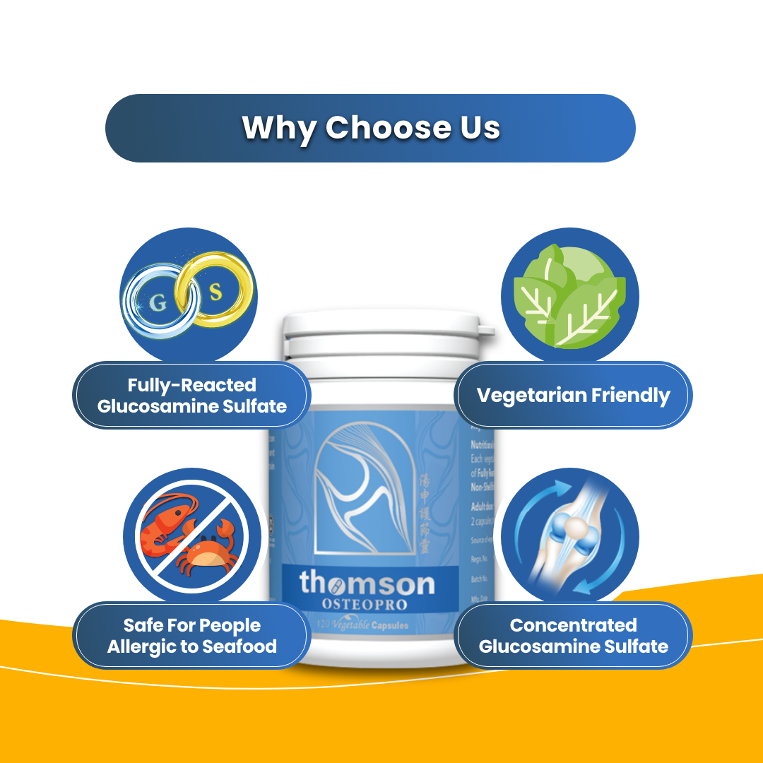 Each capsule contains 300mg of Fully Reacted Glucosamine Sulfate of non-shellfish origin. Thomson OsteoPro has helped many users for over 10 years. Each capsule is manufactured under strict Good Manufacturing Practice (GMP) and in-house quality control laboratory.