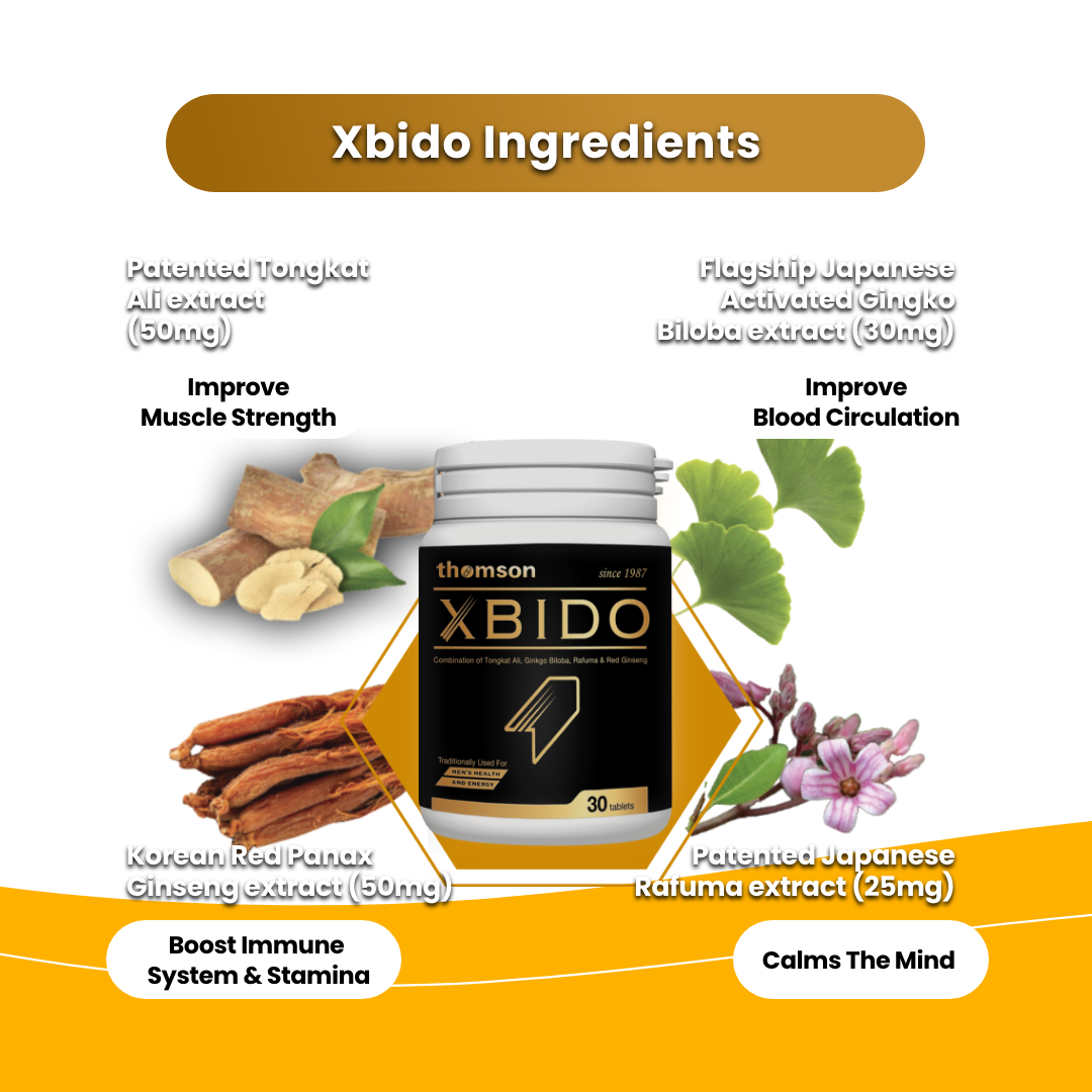 Each tablet contains 50mg Tongkat Ali Extract, 25mg Rafuma Leaves Extract, 50mg Red Ginseng Root Extract and 30mg Flagship Activated Ginkgo Biloba Extract