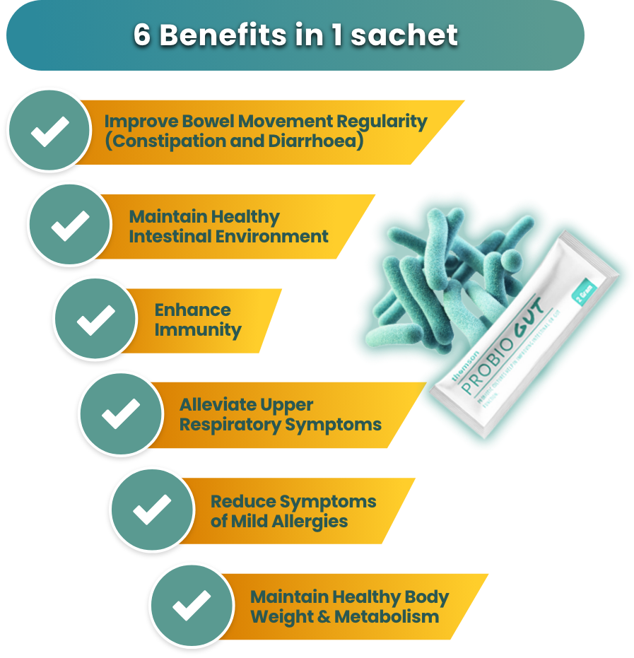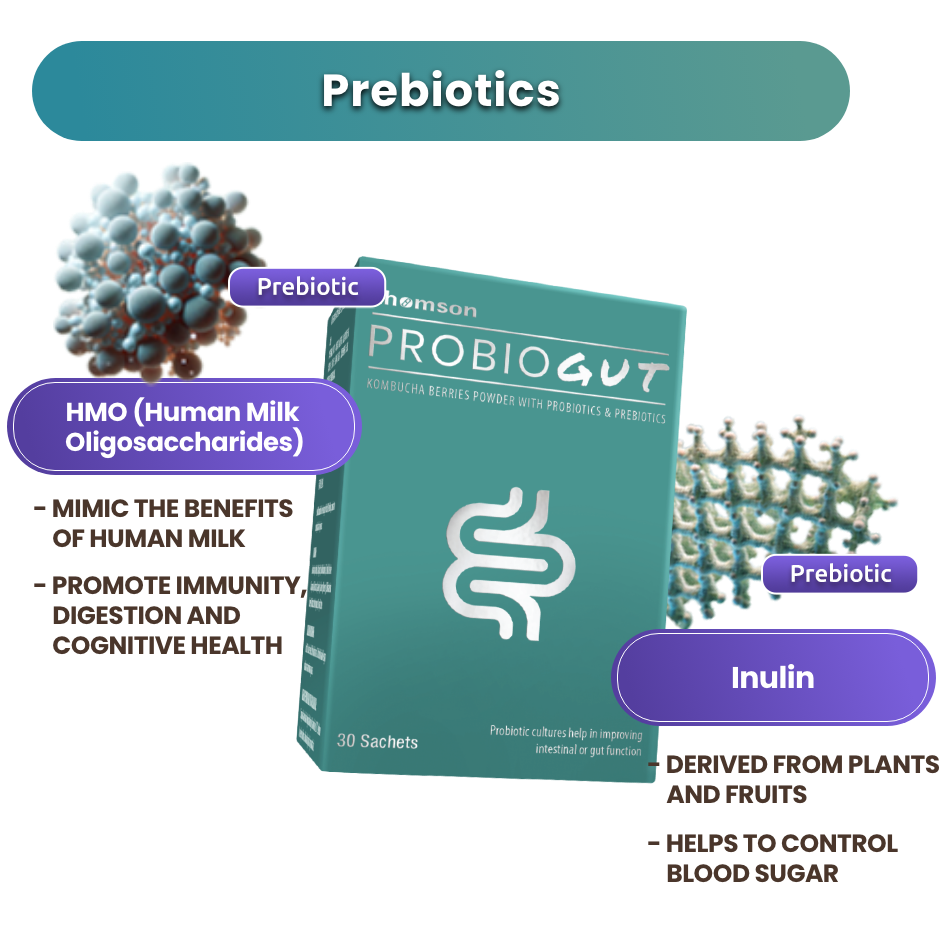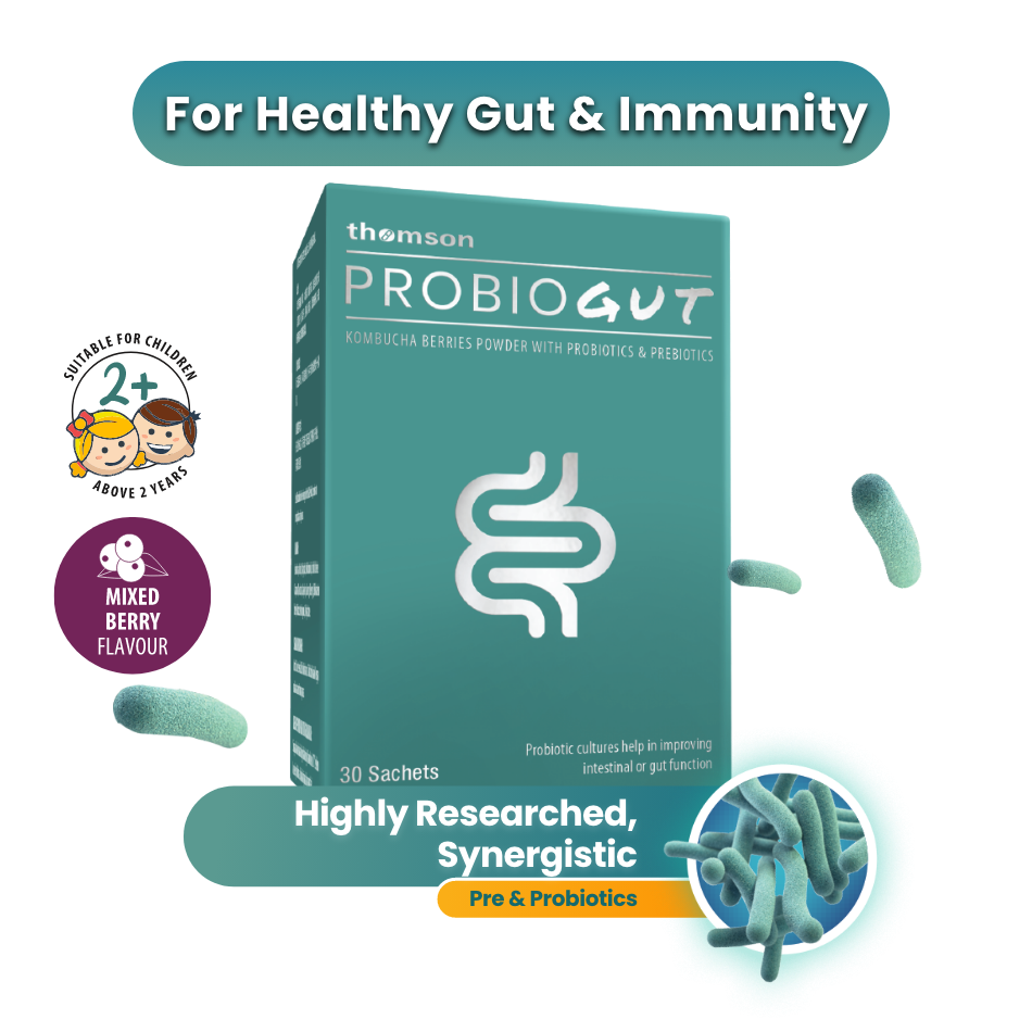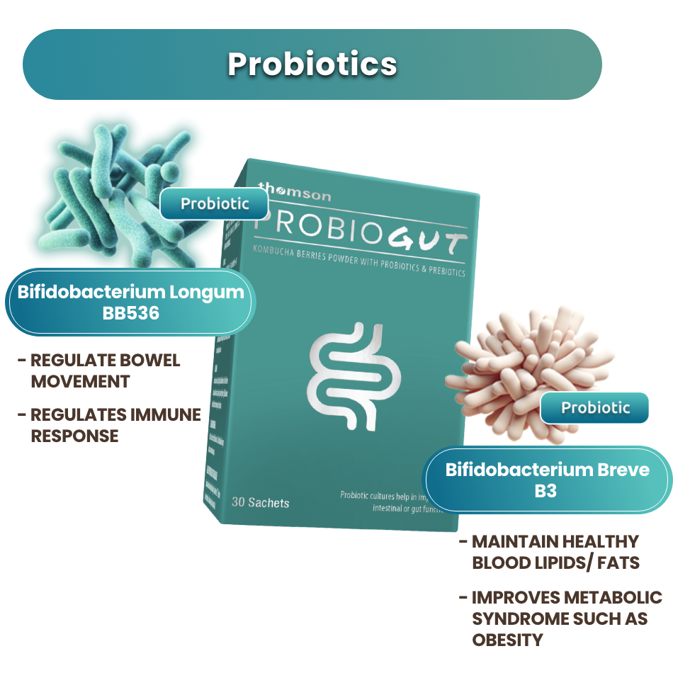 Thomson ProbioGut contains two patented Japanese probiotics, B.Longum BB536 and B.Breve B3, which support bowel health and reduce upper respiratory infections, with B. Breve B3 also aiding in weight management. The formula includes Human Milk Oligosaccharide (HMO), a prebiotic that enhances the effectiveness of the probiotics.