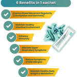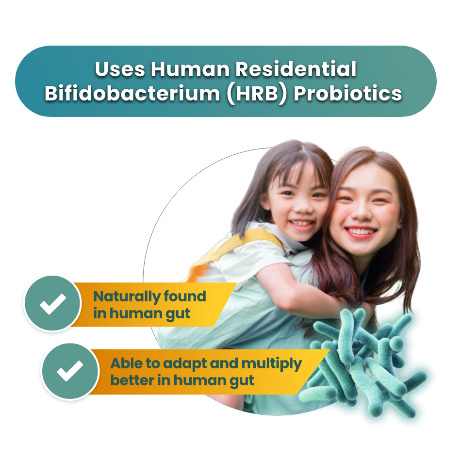 Each powder sachet contains 2 premium Japanese probiotics, B.Longum BB536 and B.Breve B3, along with 2 prebiotics Human Milk Oligosaccharide (HMO) prebiotic and Inulin for enhanced benefits. With guaranteed 7 billion CFU at end of shelf-life, it supports gut health effectively.